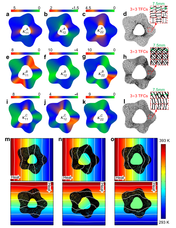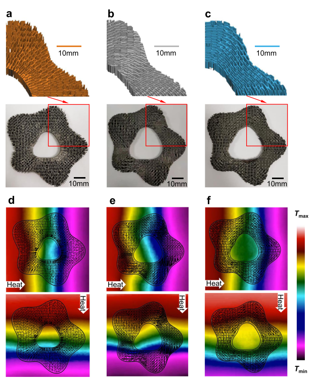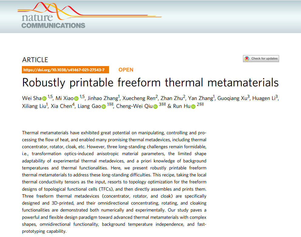 12月10日,《自然·通讯》(Nature Communications)在线刊发了机械学院高亮教授团队与新加坡国立大学仇成伟教授、能源学院胡润副教授关于热超构材料拓扑优化设计的最新研究成果“Robustlyprintable freeform thermal metamaterials(稳健可打印的自由形状热超构材料)”。机械学院博士生沙伟、副教授肖蜜为论文共同第一作者,高亮教授、仇成伟教授、胡润副教授为论文共同通讯作者,华中科技大学数字制造装备与技术国家重点实验室为论文第一完成单位。 超构材料因具有常规自然材料不具备的属性被学术界和工业界广泛关注,如力、热、声、电磁超构材料等,其中热超构材料因可操控热流获得一系列超常热学功能(如:热隐身、热集中、热伪装、热旋转等)备受关注。随着变换光学和散射抵消方法应用于热学领域,一系列具有不同功能的热超构材料纷纷被设计和制备,但是,目前热超构材料设计仍面临三大挑战:(1)利用变换热学法设计的热超构材料需采用非均匀、各向异性的材料参数,而常规材料往往不具备,使得实验制备热超构材料难度很大;(2)热超构材料结构形状受限,目前以圆形、椭圆形等规则形状的热超构材料制备居多,影响了热超构材料的工程适用性;(3)采用数值优化方法设计热超构材料依赖背景温度场和目标超常热学属性,影响了设计的灵活性和热超构材料的全方位功能性。因此,如何设计并制备具有自由形状且全方位功能性的热超构器件是热超材料领域亟需解决的难题。 图1 稳健可打印的自由形状热超构材料拓扑优化设计 针对以上难题,研究团队提出了一种稳健可打印的自由形状热超构材料拓扑优化设计方法(图1),采用拓扑优化设计具有指定导热系数的拓扑功能单胞,组装生成热超构材料,开展了自由形状热超构材料拓扑优化设计-热超构器件增材制造-热学仿真与实验性能测试。研究团队按照上述思路,设计了具有自由形状的热集中、热旋转和热隐身等三类热超构材料构型,并开展了数值仿真(图2)和热学实验(图3)性能测试,结果表明无论热流从何种方向通过三种热超构材料,其内部各自呈现出良好的热集中、热旋转和热隐身效果。 图2 拓扑优化设计的三种热超构材料及其数值仿真温度场分布(左:热集中;中:热旋转;右:热隐身) 图3 3D打印制备的热超构器件及其热学实验温度场分布 研究团队采用拓扑优化方法设计了具有自由形状、全方位功能性的热集中、热旋转和热隐身超构材料,达到了当前利用混合材料结构实现热超构材料设计的最好水平,将有力推动热超构材料在航空航天、电子等领域的工程应用。研究工作得到了国家自然科学基金(52076087)、国家重点研发计划(2020YFB1708300)等项目资助。(原文链接://mp.weixin.qq.com/s?__biz=MzU1OTI0NjU0Mw==&mid=2247484318&idx=2&sn=29300743467c0a4f98e40c28e609e3ed&chksm=fc1b7e3ecb6cf72807021182ce55d71e1e8531abb50c660a871555a2332b315eb8d9bb3254c6&scene=27)