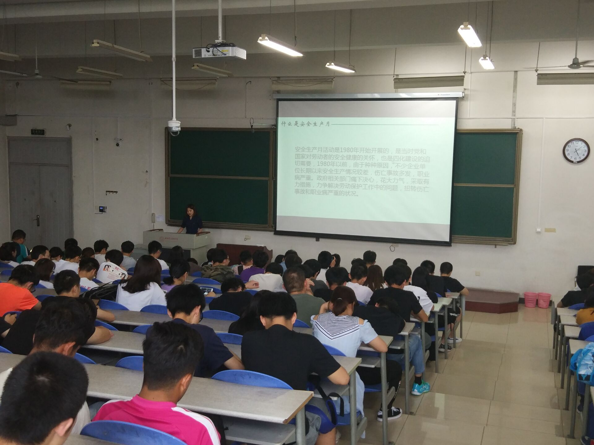 活动共进行一个小时,刘婕妤同学从活动背景、交通、用电及实验室安全等四个方面进行了专题介绍,同时通过对发生在其他校园真实案例的分析,引起同学们对平时生活安全方面的重视。活动最后列举了一些注意事项,对同学们的行为规范提出了一些要求。