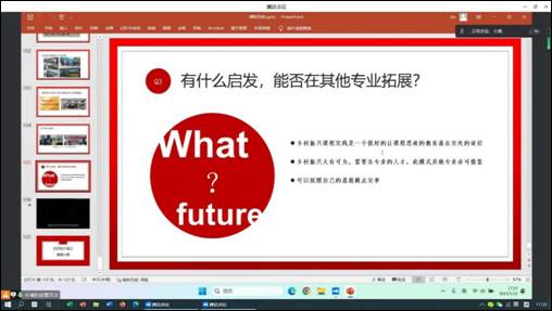 然后,丰博总结了过去几年带领学生在乡村振兴设计实践中的经验,分享了学生在实践中思想上的转变和成长,汇报了取得的丰硕成果,充分说明了在实践中贯彻课程思政的可行性和必要性。