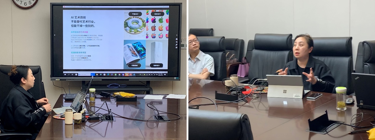 张英首先分享了AIGC技术在陶艺设计中的研究成果和成功案例,交流了教学设计和课程开发的经验。然后,讨论了如何将AIGC技术融入课堂教学,以及如何提高教学效果,分析了人工智能在教学创新中的重要作用,增进了大家对AIGC技术的理解,也为教学工作提供了新的思路和方法。接着,以基于AIGC的精美设计为例,阐述了“设计+审美”的关系,认为个体审美素养的提升与技术融合是相辅相成的,在技术融合的同时要加强审美素养的培养。最后,与会者还就如何将AIGC技术融入课堂教学、提高教学效果等问题展开了热烈讨论。