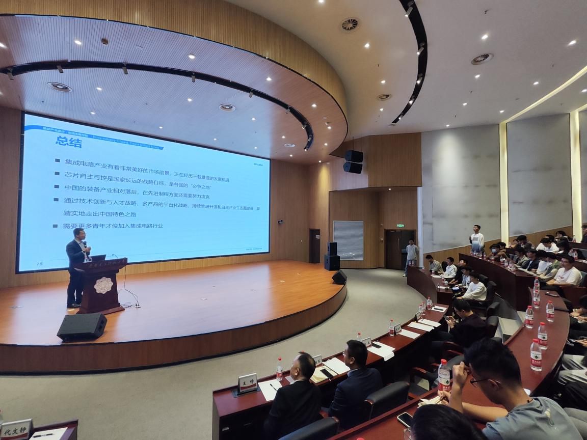 在前期科研项目、人才培养和产业链等方面合作的基础上,为学院“集成电路装备自强班”专门开设“制造强国”系列课程。10月9日下午,北方华创微电子装备有限公司总裁董博宇受邀在南校区会议中心B101报告厅讲授第一门系列课程第一讲——《集成电路装备产业概述》,“集成电路装备自强班”的200余名学生认真聆听了课程,北方华创总裁助理夏振军,人力资源中心高校关系总监王铮,学院相关系所教师代表、本科生辅导员代表在现场共同旁听了本次课程。