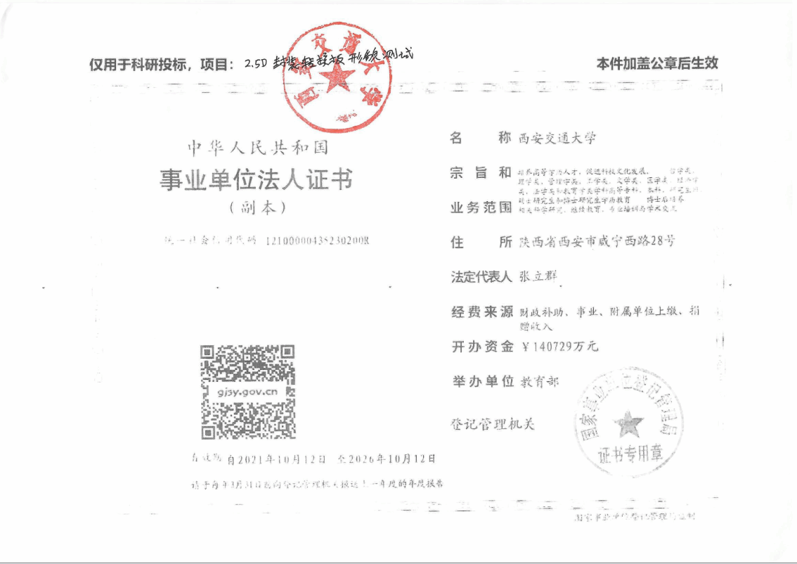 按照《西安电子科技大学科研协作项目管理办法(试行)》文件规定,为加强学校科研协作项目的管理,确保面向射频器件2.5D封装转接板多场耦合可靠性研究的顺利进行。西安交通大学与项目负责人王永坤将开展科研合作,现将合作相关事项公示如下: