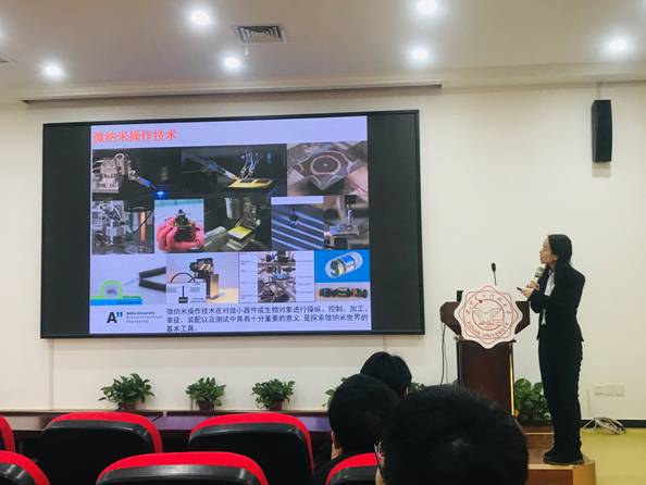 常博教授首先介绍了传统的基于机器人取放原理的微组装技术。然而,随着半导体电子设备趋于微型化,器件组装的定位和对齐精度要求更高,传统的利用微小夹持器实现微纳器件精准定位和组装的技术遇到了瓶颈,无法同时满足高效率和高精度组装的要求。针对这一问题,常博教授介绍了复合微组装的概念,将传统机器人取放技术和基于表面张力的自对齐技术结合,利用传统机器人速度快的特点,实现微纳芯片的快速初定位。然后,利用表面张力自组装定位精度高的优势,进行二次精确定位,从而最终实现高效高精度的芯片定位和对齐。最后,常博教授为到场师生讲解了此项技术在凸台结构、亲水/疏水结构、分区结构,尤其在可穿戴柔性可拉伸器件制造等方向的应用。