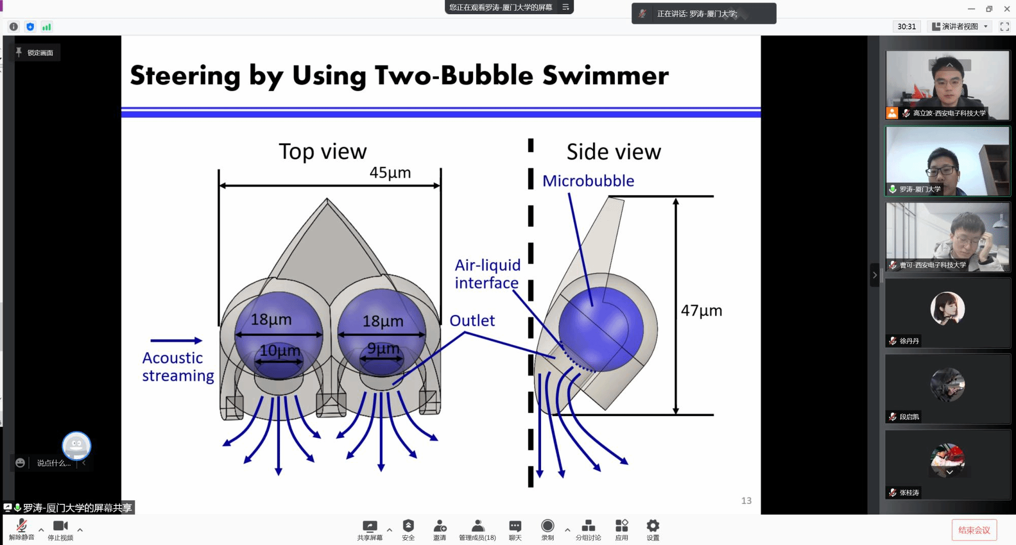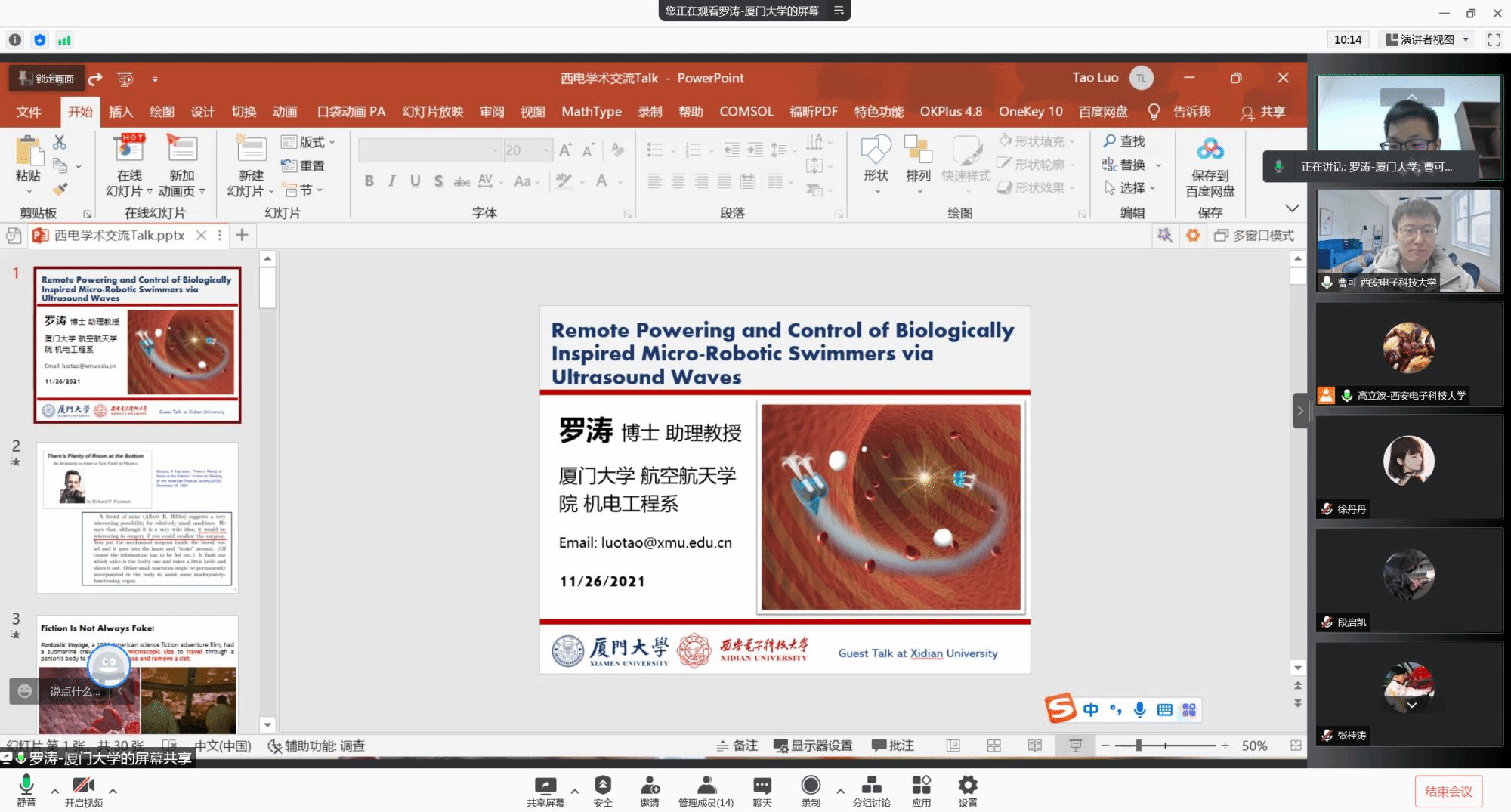 高立波的邀请,厦门大学航空航天学院机电工程系助理教授应邀在线上作了题为《Remote Powering and Control of Biologically Inspired Micro-Robotic Swimmers via Ultrasound Waves》的学术报告。本次报告因疫情原因改为线上,高立波,王明智,曹可等测控系师生参加,高立波副教授主持。