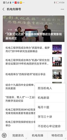 5.利用信息化手段促进基层党组织建设效率提升。依托学院党建微信公众平台“机电先锋号”搭载的“一云台两专栏四推送”---即“党建云”智慧管理系统平台,“党建资讯”、“特色栏目”两个专栏将党章党纪党规和专题教育的相关内容融于其中以及每月推送四次党建要闻宣传党的政策、传达上级精神、交流“不忘初心、牢记使命”主题教育的工作经验。特别是通过“机电先锋”党建云智慧管理系统平台大大提高了基层党组织的工作效率:通过“党费收缴”实现党费一键“秒交”,每月按时交党费,永远不忘共产党员身份;通过“红色足迹”方便分享党员个体的学习体会和成长经历,拉近了心与心的距离;通过“通知公告”把中央要求、上级文件、工作安排轻松放到每个党员口袋里;通过“红色书屋”把成千上万本理论书籍摆到大家面前,网上下单分分钟送到;会议通知、电子签到、党务公开、组织建设一个个功能真正做到整合资源、充实数据、科学运用、优化机制,营造“红色空间”党建氛围,切实提升了学院基层党建工作的质量。今年主题教育以来为解决党员发展中的规范化问题我们新上线“党员发展”模块将党员发展的“五大步25小步”融入系统实现线上线下党员发展全流程辅导,全过程纪录。我院《打造“智慧党建”创新平台,提高基层党建工作水平——以“机电先锋号”创新平台建设为例》也荣获了校十佳党建特色案例。